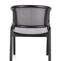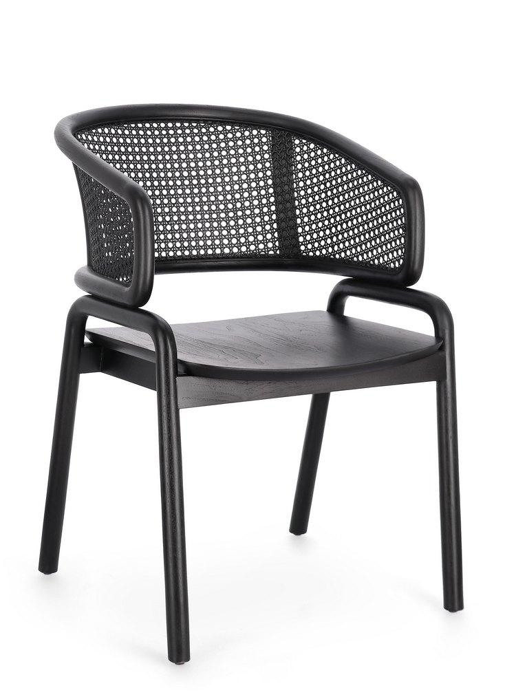 The structure is made of teak wood with a natural black color finish. The intertwined rattan backrest adds a touch of elegance and uniqueness and makes the seat comfortable, as it embraces the whole chair also serving as an armrest. Ideal for a contemporary, vintage, or retro decor, in the kitchen, dining room, living room, for indoor use.