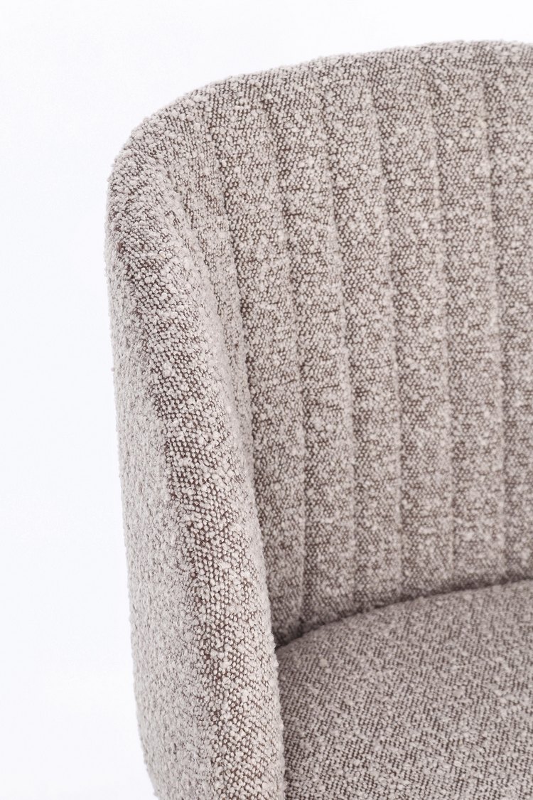 Characterized by a structure in melamine-coated wood, supported by legs in powder-coated steel black in color, it offers stability and durability. The seat, with its enveloping shape, is padded with polyurethane foam and covered in a soft bouclé fabric, mink in color, with vertical stitching on the backrest, giving it a sophisticated style.