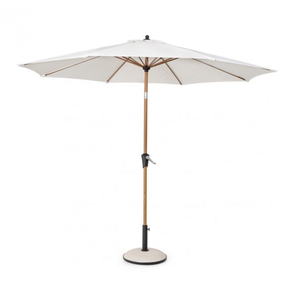 La structure en acier traité pour l’extérieur, avec une peinture en poudre effet bois, garantit résistance et durabilité dans le temps, tandis que le mât central avec articulation en zinc permet de régler l’inclinaison pour une ombrage optimale tout au long de la journée. Le tissu blanc en polyester est léger mais résistant, complet avec une cheminée anti-vent utile pour améliorer sa stabilité les jours venteux.
