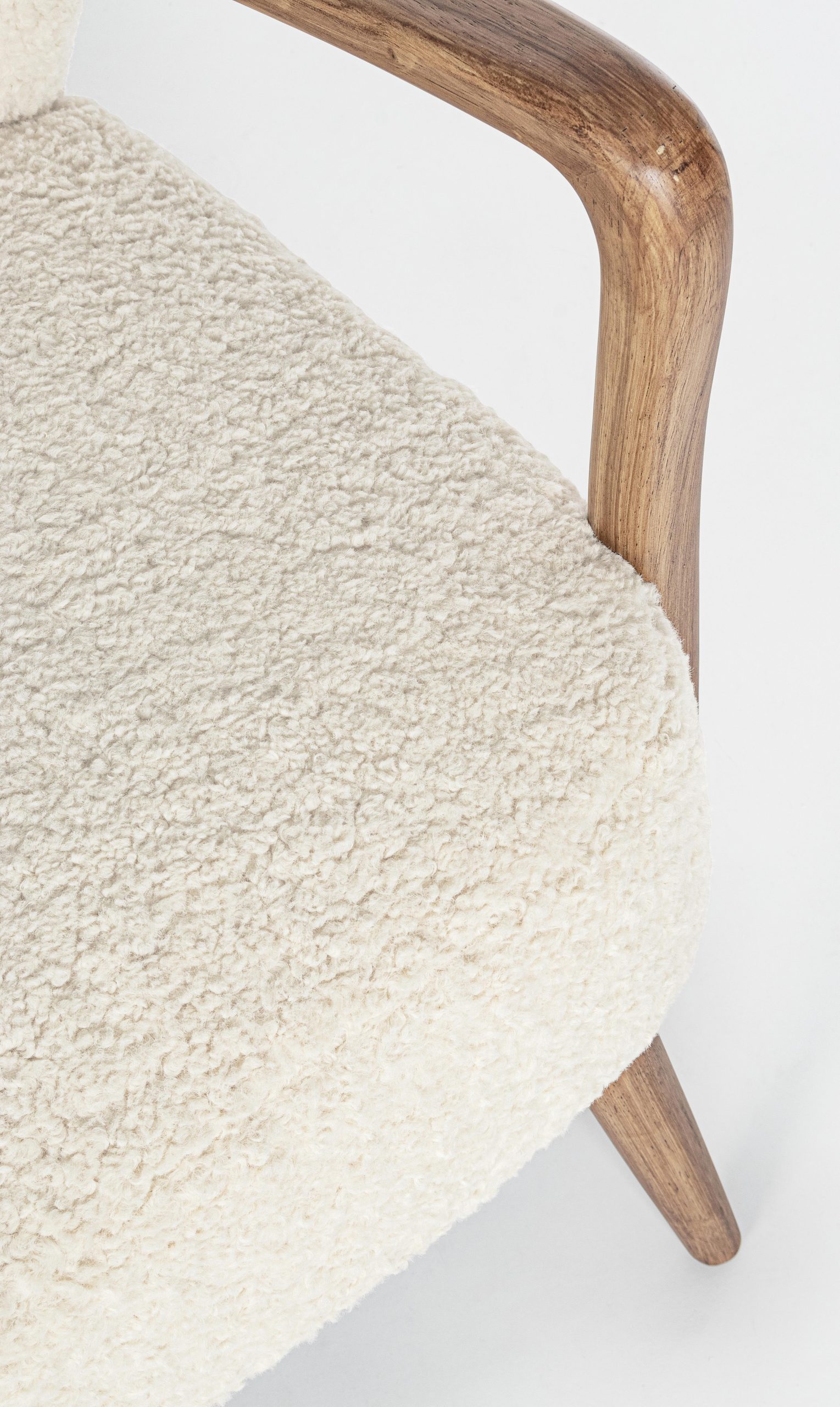 Fauteuil MORITZ en tissu polyester effet laine blanc, confortable et au style vintage. Sa structure est en bois de pin, les pieds et les accoudoirs en bois de caoutchouc verni.