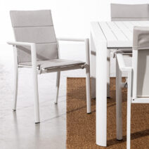 Ce type de chaise, caractérisé par une structure avec des accoudoirs en aluminium laqué blanc en poudre, est donc résistant aux intempéries, offrant durabilité et stabilité. Le siège et le dossier sont en textilène, un matériau résistant qui, en plus de garantir le confort, facilite l’entretien.