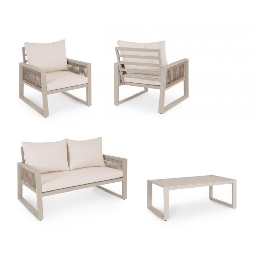 Les assises en textilène de couleur taupe offrent confort et respirabilité, tandis que l’intérieur avec des cordes en textilène, également couleur taupe, ajoute une touche d’originalité et de design sur le côté des assises, au niveau des accoudoirs.