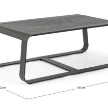 This coffee table features a powder-coated aluminum structure, its rectangular and rounded shape makes it perfect to be placed next to armchairs or sofas in the garden, terrace, or patio.