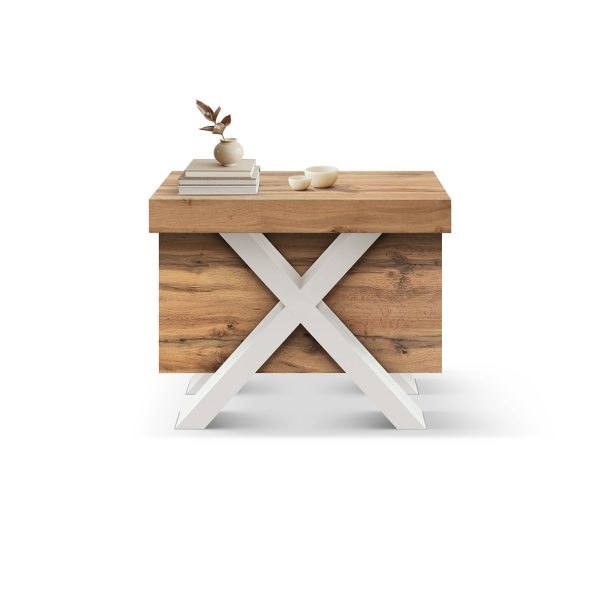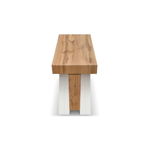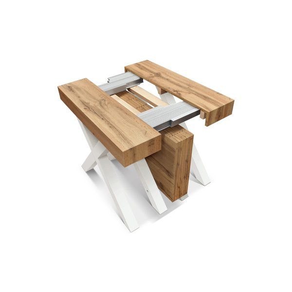 In questa variante, le gambe in MDF bianco rendono l’insieme più luminoso e leggero alla vista, perfetto per ambienti chiari e contemporanei. Le guide in metallo/alluminio scorrono in modo fluido e aiutano a mantenere stabilità e planarità in ogni configurazione. In più, il pratico vano porta-allunghe integrato ti permette di riporre le prolunghe quando non servono, mantenendo tutto in ordine e sempre a portata di mano.