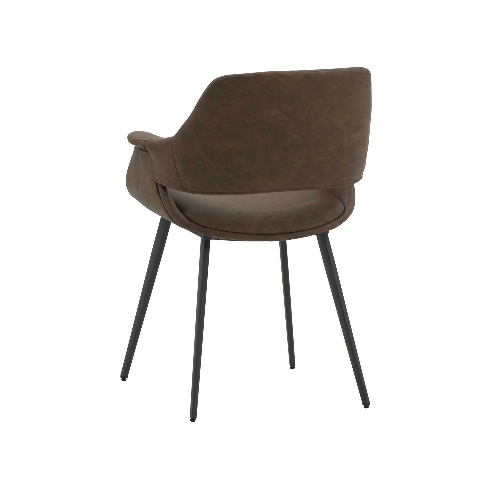 Lo schienale e la seduta sono completamente rivestiti in similpelle marrone che le rende piacevoli. Le linee curve e i braccioli rendano le sedie confortevoli. Le gambe in metallo verniciato nero offrono un piacevole contrasto visivo con il rivestimento in similpelle esaltando la leggerezza.