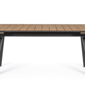 Struttura in alluminio e piano verniciato effetto legno. Il piano ĆØ estendibile tramite il sistema di apertura a balzo, le prolunghe sono poste lateralmente.